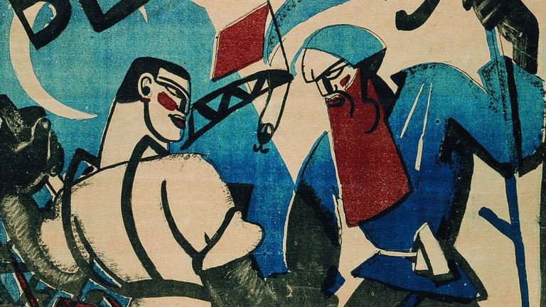 Dabei darf man es durchaus ernst nehmen, das Plakat der Oktoberrevolution. Entstanden an der Schnittstelle zwischen vorrevolutionärer Produktwerbung, russischem Bilderbogen (Lubok), frühen Filmplakaten und anderen visuellen Traditionen verfügte es anfangs über vieles nicht: ein klares Gegenstandskonzept, eine Strategie, eine Zielgruppendefinition, eine stabile Symbolik, letztlich über all das, was eine ‚OldProp‘ (Alex S. Edelstein) dringend benötigt. Seine eigentliche Entwicklungsdynamik bezog das Plakat der Revolution aus seiner diskursiven wie handlungsbezogenen Einbettung: es war (und blieb für viele Jahrzehnte) Teil und Instrument militärischer Aktion mit den bekannten Implikation wie z. B. einem rigiden Schwarz-Weiß-Denken, plausiblen Feindbildern, ungeschminkten Handlungsimperativen.