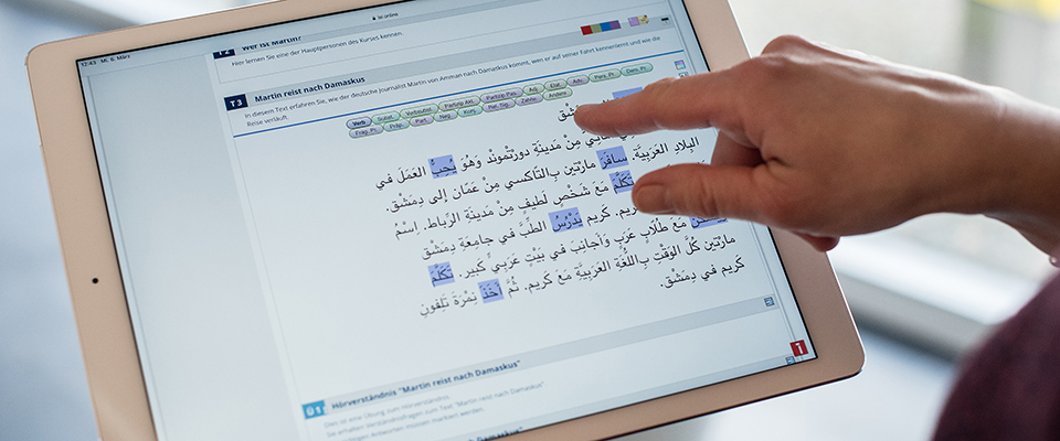 Das auf der Lernplattform LSI.Digital basierende E-Learning Arabisch enthält sämtliche Lehrbuchtexte und -dialoge, die durch eine integrierte Wörterbuchfunktion und entsprechende Grammatikinformationen aufbereitet wurden. Je nach Lernstand können Texte und Dialoge mit und ohne Vokalisierung gelesen werden. Inhaltsbezogene und grammatische Übungen zu jedem einzelnen Text fördern ein tieferes und nachhaltigeres Textverständnis, das auf diese Weise auch überprüft werden kann.