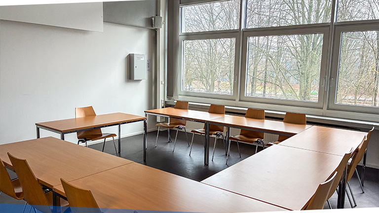 Während Ihres Kurses steht Ihnen weiterhin das Gästehaus in der Laerholzstraße als Unterkunft zur Verfügung. Die Seminarräume sind von dort aus etwa einen Kilometer entfernt und bequem zu Fuß erreichbar. Im Haus finden Sie eine großzügige Lounge mit Kochmöglichkeiten und Kühlschränken, die Sie während des Kurses zur Selbstverpflegung nutzen können.