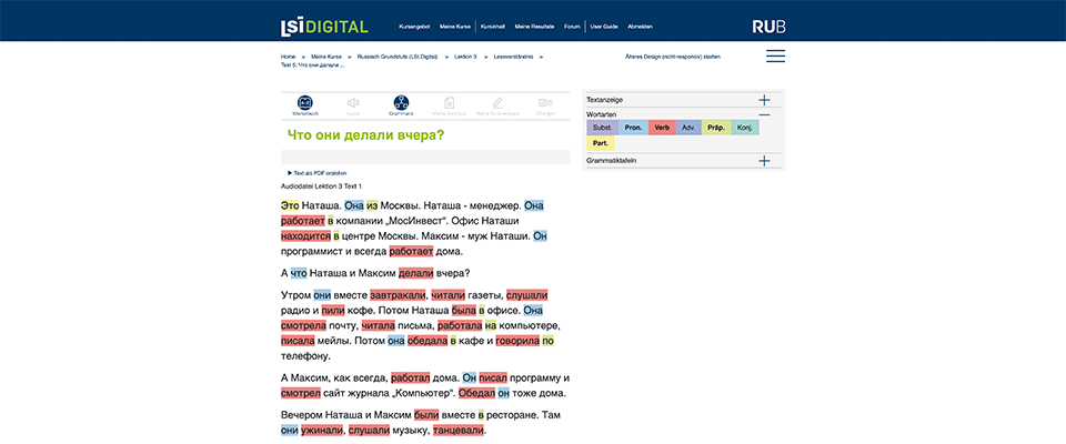 Der auf der Lernplattform LSI.Digital angebotene E-Learning-Kurs enthält sämtliche Lehrbuchtexte und -dialoge inklusive Vertonung, die durch eine integrierte Wörterbuchfunktion, umfangreiche Grammatikinformationen und anschauliche Lehrvideos aufbereitet wurden. Übungen zum Textverständnis begleiten die Texte.